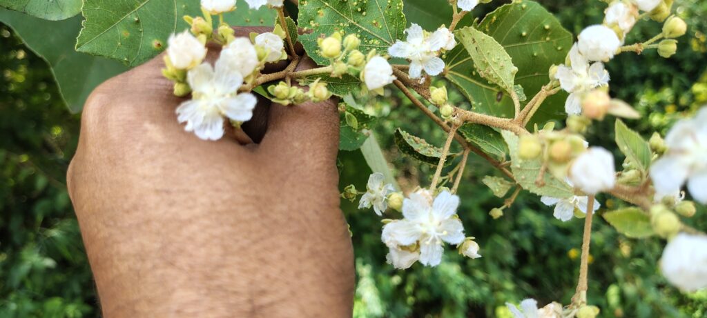 Kydia is considered as a monotypic genus under malvaceae family and is found around Indian sub-continent. I have seen this tree in lower Nilgiris ghat road, grows to around 8 meters in height. The tree looks glorious when in full bloom with its white flowers, often not noticed because the petals fall off fast. The leafs are simple, alternatively arranged, slightly hairy. The leaf is shallowly lobed into 5 sections. The inflorescence is in the form of a panicles. Flowers are polygamous, white in color with pinkish streaks. The fruit is in the form of a capsule. The fruit along with calyx elements appear in rusty clusters.The plant is much sort after for foraging by forest animals. It is the larval host plant for White branded Ace butterfly.